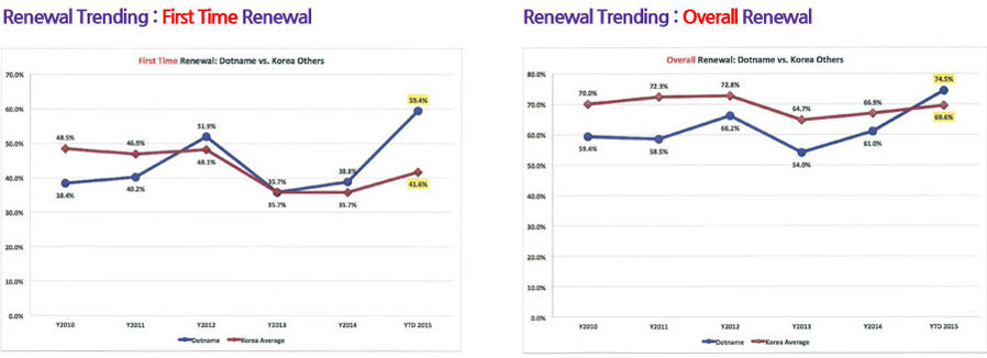 1도메인 국내 연장율 1위!닷네임코리아는 레지스트리인 versign에 인증 받은 도메인 연장율 1위 기업입니다. 도메인 서비스를 처음 이용한 후 만료시 다시 연장하는 연장율도 1위이면 지속적으로 도메인을 연장하는 연장율도 1위입니다. |