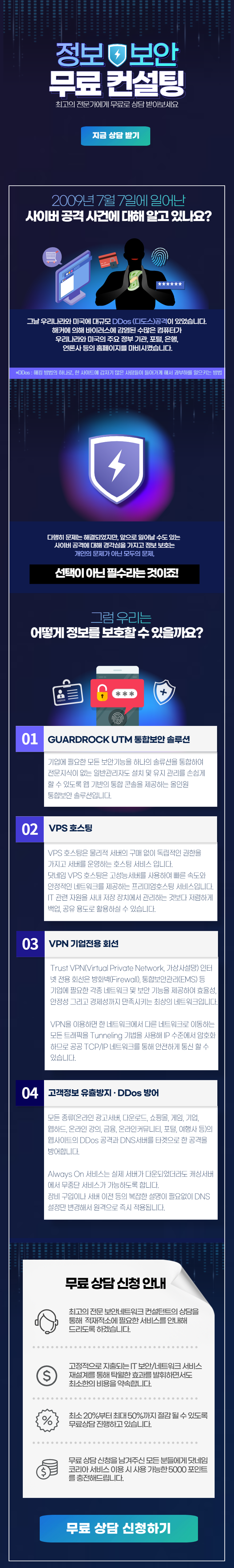 정보보안 무료 컨설팅 최고의 전문가에게 무료로 상담 받아보세요 2009년 7월 7일에 일어난 사이버 공격 사건에 대해 알고 있나요? 그날 우리나라와 미국에 대규모 DDos (디도스)공격이 있었습니다. 해커에 의해 바이러스에 감염된 수많은 컴퓨터가 우리나라와 미국의 주요 정부 기관, 포털, 은행,언론사 등의 홈페이지를 마비시켰습니다. *DDos : 해킹 방법의 하나로, 한 사이트에 갑자기 많은 사람들이 들어가게 해서 과부하를 일으키는 방법 다행히 문제는 해결되었지만, 앞으로 일어날 수도 있는 사이버 공격에 대해 경각심을 가지고 정보 보호는 개인의 문제가 아닌 모두의 문제,선택이 아닌 필수라는 것이죠! 그럼 우리는 어떻게 정보를 보호할 수 있을까요? GUARDROCK UTM 통합보안 솔루션 기업에 필요한 모든 보안기능을 하나의 솔류션을 통합하여 전문지식이 없는 일반관리자도 설치 및 유지 관리를 손쉽게 할 수 있도록 웹 기반의 통합 콘솔을 제공하는 올인원 통합보안 솔루션입니다. VPS 호스팅 VPS 호스팅은 물리적 서버의 구매 없이 독립적인 권한을 가지고 서버를 운영하는 호스팅 서비스 입니다. 닷네임 VPS 호스팅은 고성능서버를 사용하여 빠른 속도와 안정적인 네트워크를 제공하는 프리미엄호스팅 서비스입니다. IT 관련 자원을 사내 저장 장치에서 관리하는 것보다 저렴하게 백업, 공유 용도로 활용하실 수 있습니다. VPN 기업전용 회선 Trust VPN(Virtual Private Network, 가상사설망) 인터넷 전용 회선은 방화벽(Firewall), 통합보안관리(EMS) 등 기업에 필요한 각종 네트워크 및 보안 기능을 제공하여 효율성,안정성 그리고 경제성까지 만족시키는 최상의 네트워크입니다. VPN을 이용하면 한 네트워크에서 다른 네트워크로 이동하는 모든 트래픽을 Tunneling 기법을 사용해 IP 수준에서 암호화하므로 공공 TCP/IP 네트워크를 통해 안전하게 통신 할 수 있습니다. 고객정보 유츌방지 · DDos 방어 모든 종류(온라인 광고서버, 다운로드, 쇼핑몰, 게임, 기업, 웹하드, 온라인 강의, 금융, 온라인커뮤니티, 포털, 여행사 등)의 웹사이트의 DDos 공격과 DNS서버를 타겟으로 한 공격을 방어합니다. Always On 서비스는 실제 서버가 다운되었더라도 캐싱서버에서 무중단 서비스가 가능하도록 합니다. 장비 구입이나 서버 이전 등의 복잡한 설명이 필요없이 DNS 설정만 변경해서 원격으로 즉시 적용됩니다. 무료 상담 신청 안내 최고의 전문 보안네트워크 컨설턴트의 상담을 통해 적재적소에 필요한 서비스를 안내해드리도록 하겠습니다. 고정적으로 지출되는 IT 보안/네트워크 서비스 재설계를 통해 탁월한 효과를 발휘하면서도 최소한의 비용을 약속합니다. 최소 20%부터 최대 50%까지 절감 될 수 있도록 무료상담 진행하고 있습니다. 무료 상담 신청을 남겨주신 모든 분들에게 닷네임 코리아 서비스 이용 시 사용 가능한 5000 포인트를 충전해드립니다. 무료 상담 신청하기