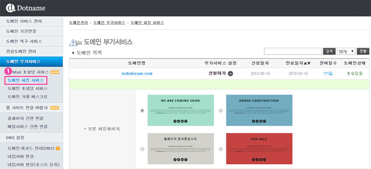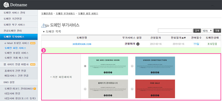 3. 파킹 설정을 통해 보여줄 문구를 선택합니다. (홈페이지 준비 중 입니다, 공사 중, 판매 중 등)