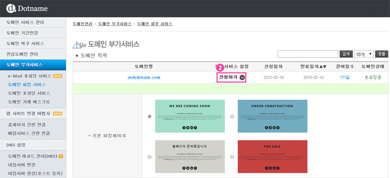 2. 파킹 연결을 하고자 하는 도메인의 신청하기 버튼을 클릭합니다.
