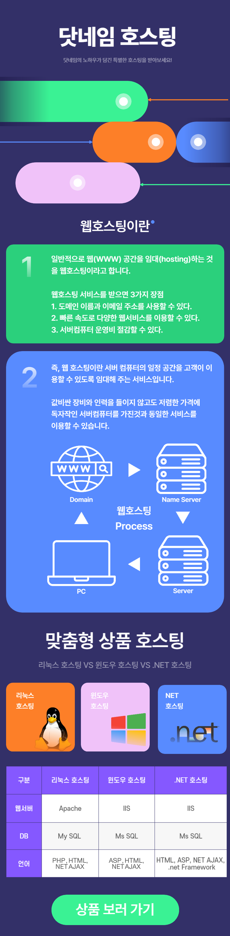닷네임 호스팅 닷네임의 노하우가 담긴 특별한 호스팅을 받아보세요! 웹호스팅이란 일반적으로 웹(WWW) 공간을 임대(hosting)하는 것을 웹호스팅이라고 합니다. 웹호스팅 서비스를 받으면 3가지 장점 1. 도메인 이름과 이메일 주소를 사용할 수 있다.  2. 빠른 속도로 다양한 웹서비스를 이용할 수 있다.  3. 서버컴퓨터 운영비 절감할 수 있다. 즉, 웹 호스팅이란 서버 컴퓨터의 일정 공간을 고객이 이용할 수 있도록 임대해 주는 서비스입니다. 값비싼 장비와 인력을 들이지 않고도 저렴한 가격에 독자작인 서버컴퓨터를 가진것과 동일한 서비스를 이용할 수 있습니다. 맞춤형 상품 호스팅 리눅스 호스팅 VS 윈도우 호스팅 VS .NET 호스팅