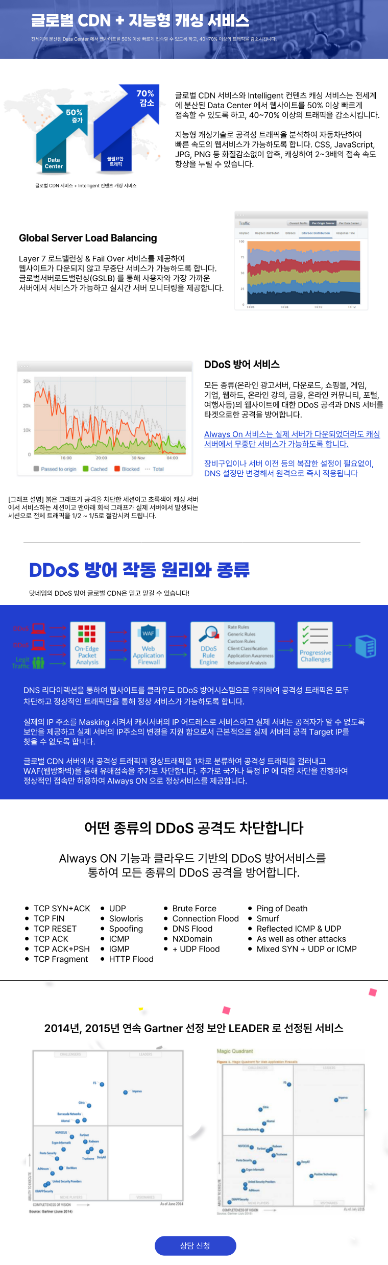 디도스란? 해당 사이트나 서버에 과부하를 주어서 일을 못하게 멈추는 형태를 말합니다. 기업 입장에서 이런 DDOS 공격을 당하게 되어 사이트가 먹통이 되면 굉장히 곤란하겠죠? ​ 이런 DDOS를 방어할 수 있는 닷네임 서비스가 출시되었습니다! ​ ​ 글로벌 CDN + 지능형 캐싱 서비스 글로벌 CDN 서비스와 Intelligent 컨텐츠 캐싱 서비스는 전세계에 분산된 Data Center 에서 웹사이트를 50% 이상 빠르게 접속할 수 있도록 하고, 40~70% 이상의 트래픽을 감소시킵니다. ​ 지능형 캐싱기술로 공격성 트래픽을 분석하여 자동차단하여 빠른 속도의 웹서비스가 가능하도록 합니다. CSS, JavaScript, JPG, PNG 등 화질감소없이 압축, 캐싱하여 2~3배의 접속 속도 향상을 누릴 수 있습니다. ​ ​ Global Server Load Balancing Layer 7 로드밸런싱 & Fail Over 서비스를 제공하여 웹사이트가 다운되지 않고 무중단 서비스가 가능하도록 합니다. ​ 글로벌서버로드밸런싱(GSLB) 를 통해 사용자와 가장 가까운 서버에서 서비스가 가능하고 실시간 서버 모니터링을 제공합니다. DDoS 방어 서비스 모든 종류(온라인 광고서버, 다운로드, 쇼핑몰, 게임, 기업, 웹하드, 온라인 강의, 금융, 온라인 커뮤니티, 포털, 여행사등)의 웹사이트에 대한 DDoS 공격과 DNS 서버를 타겟으로한 공격을 방어합니다. ​ Always On 서비스는 실제 서버가 다운되었더라도 캐싱서버에서 무중단 서비스가 가능하도록 합니다. ​ 장비구입이나 서버 이전 등의 복잡한 설정이 필요없이, DNS 설정만 변경해서 원격으로 즉시 적용됩니다. ​ 붉은 그래프가 공격을 차단한 세션이고 초록색이 캐싱서버에서 서비스하는 세션이고 맨아래 회색 그래프가 실제 서버에서 발생되는 세션으로 전체 트래픽을 1/2 ~ 1/5로 절감시켜 드립니다. ​ ​ 작동원리 DNS 리다이렉션을 통하여 웹사이트를 클라우드 DDoS 방어시스템으로 우회하여 공격성 트래픽은 모두 차단하고 정상적인 트래픽만을 통해 정상 서비스가 가능하도록 합니다. ​ 실제의 IP 주소를 Masking 시켜서 캐시서버의 IP 어드레스로 서비스하고 실제 서버는 공격자가 알 수 없도록 보안을 제공하고 실제 서버의 IP주소의 변경을 지원 함으로서 근본적으로 실제 서버의 공격 Target IP를 찾을 수 없도록 합니다. ​ ​ 글로벌 CDN 서버에서 공격성 트래픽과 정상트래픽을 1차로 분류하여 공격성 트래픽을 걸러내고 WAF(웹방화벽)을 통해 유해접속을 추가로 차단합니다. 추가로 국가나 특정 IP 에 대한 차단을 진행하여 정상적인 접속만 허용하여 Always ON 으로 정상서비스를 제공합니다. ​ 어떤 종류의 DDoS 공격도 차단합니다. Always ON 기능과 클라우드 기반의 DDoS 방어서비스를 통하여 모든 종류의 DDoS 공격을 방어합니다. ​ TCP SYN+ACK / TCP FIN / TCP RESET / TCP ACK / TCP ACK+PSH / TCP Fragment / UDP / Slowloris / Spoofing / ICMP / IGMP / HTTP Flood / Brute Force / Connection Flood / DNS Flood / NXDomain / Mixed SYN + UDP or ICMP / + UDP Flood / Ping of Death / Smurf/ Reflected ICMP & UDP / As well as other attacks ​ ​ DDoS BOT 탐지 차단 및 신청 안내 ​ Layer 3, 4, 7 의 DDoS 공격과 행동패턴 분석을 통해 평판기반 휴리스틱 엔진으로 DDoS BOT 과 게시판 및 댓글 BOT 등을 차단하고 정상적인 사람의 접속만을 허용합니다. 카드 구독 결제 세팅비 면제로 1년 약정 제공됩니다. 약관 동의시에 구독결제하시면 됩니다.