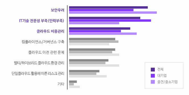 IT 컨설팅업체 베스핀글로벌의 국내 클라우드 도입 현주소(2019 State of Cloud Adoption in Korea)’ 설문 조사에 따르면, 국내 기업의 47%가 클라우드 도입 시 ‘보안’에 대한 고민이 가장 크다고 합니다. 그 다음으로 44%가 전문 인력의 부족으로, 40.3%가 비용관리의 어려움으로 인한 고민이 있다고 응답했습니다.